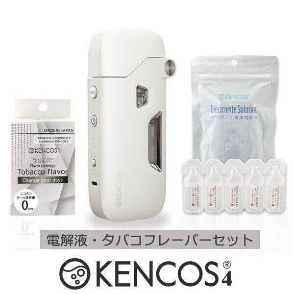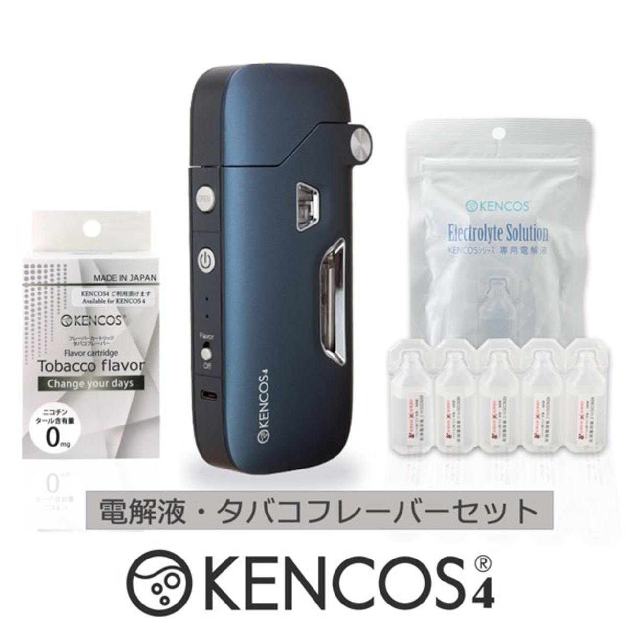 ■『 電解液 フレーバーセット』内容:KENCOS4 ×1台、電解液1袋(9ml×5本入り)、タバコフレーバーカートリッジ1箱(3本入り)
